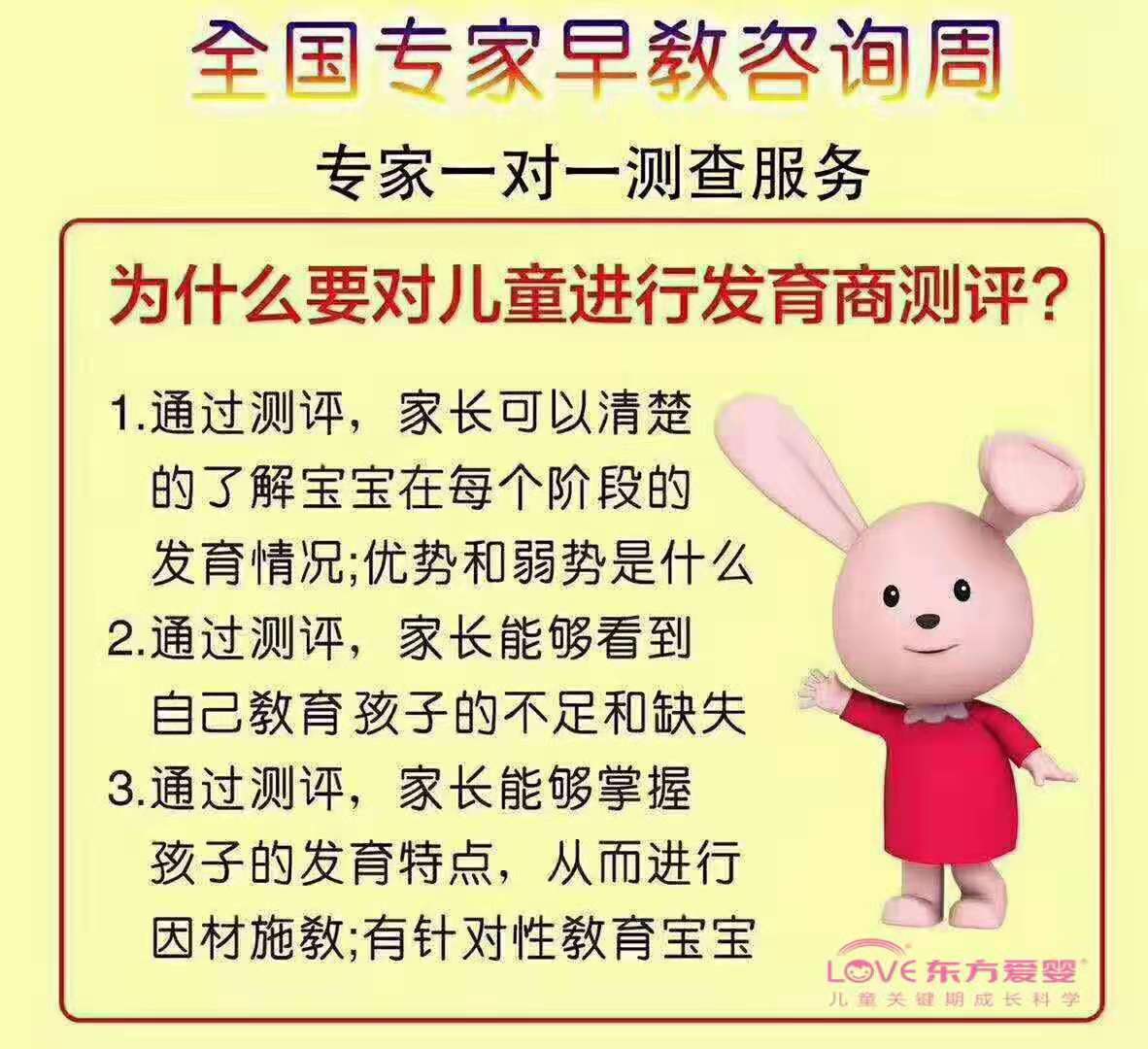 孩子是您的希望、祖国未来。想让您的孩子有一个良好的生活、学习环境,身心得到健康发展吗?东方爱婴早教中心将是孩子的理想乐园。我中心园所办园宗旨“一切为了孩子,为了孩子的一切“,使幼儿在德、智、体、美、劳诸方面得到全面发展。 让孩子插上梦想的翅膀,展翅高翔吧,请家长带孩子先参观后入园,早教中心园所的大门永远为你敞开。