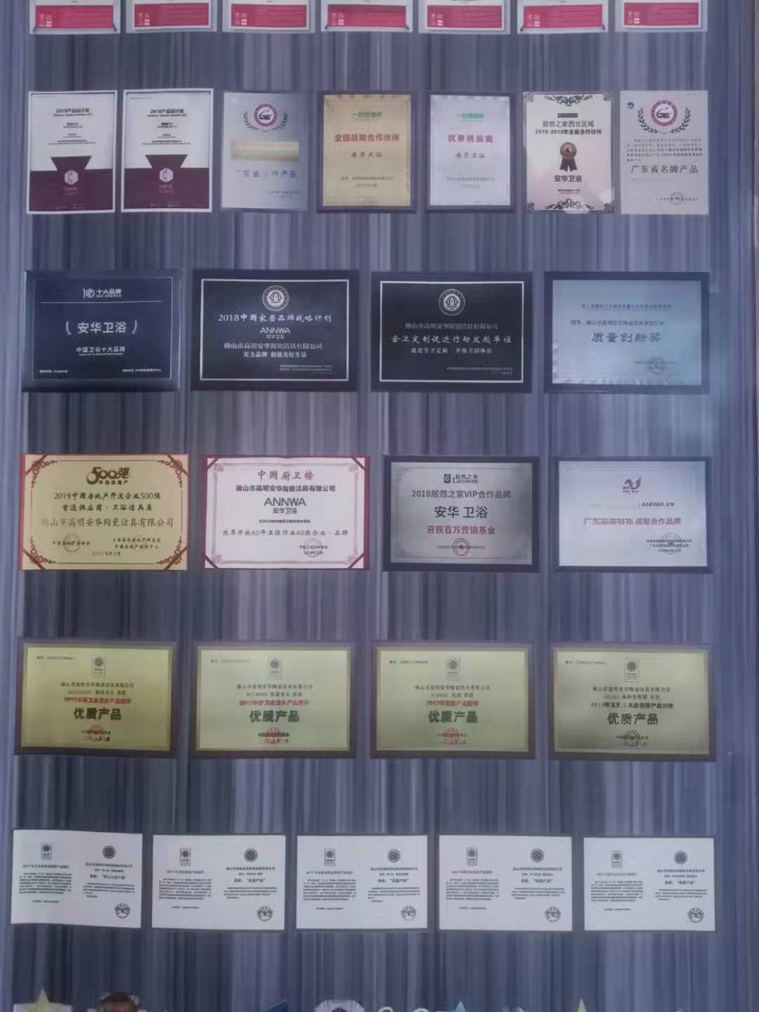 卓越的品质、完善的服务,让安华卫浴先后通过《ISO14001环境管理体系认证》、《中国节水产品认证》、《采用国际标准产品标志证书》、《高新技术企业证书》等多项权威认证,并荣膺《广东省名牌产品》、《广东省著名商标》、《中国建筑装饰协会厨卫工程委员会副会长单位》、《红棉中国设计奖》等品牌盛誉,彰显出安华卫浴的雄厚实力与辉煌业绩。