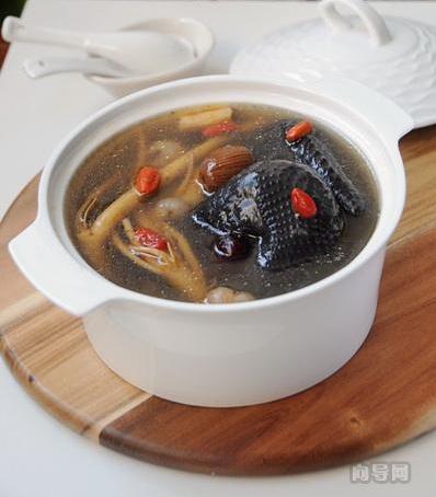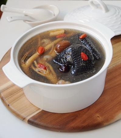 乌鸡汤是广东省传统的地方名菜,以乌鸡、阿胶、黄精、桂圆、红枣、枸杞等食材制作而成。乌鸡营养丰富,并含有激素和紫色素,对人体白血球和血色素有增强的作用。