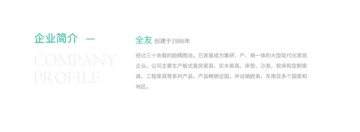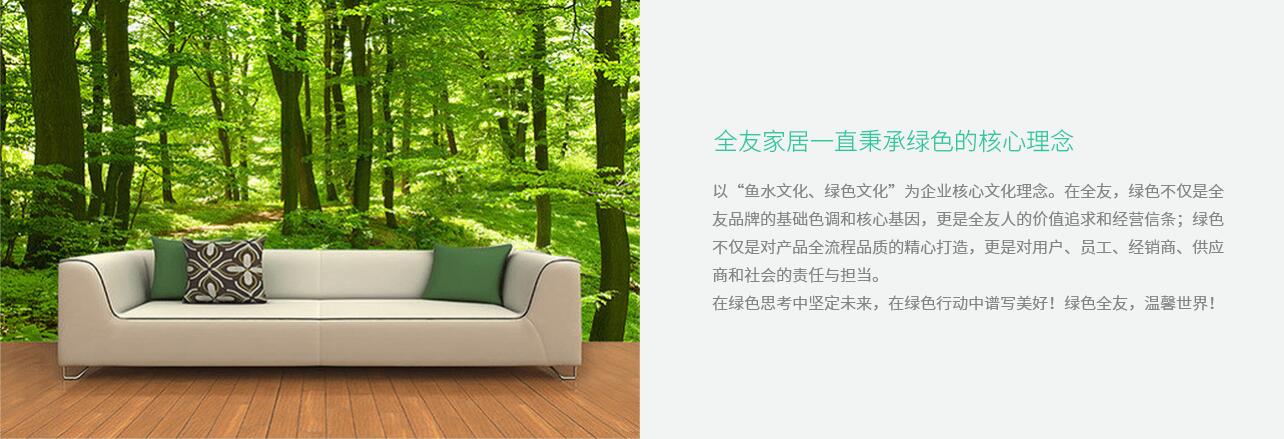 公司一直秉承绿色的核心理念,以“鱼水文化、绿色文化”为企业核心文化理念。在全友,绿色不仅是全友品牌的基础色调和核心基因,更是全友人的价值追求和经营信条;绿色不仅是对产品全流程品质的精心打造,更是对用户、员工、经销商、供应商和社会的责任与担当。